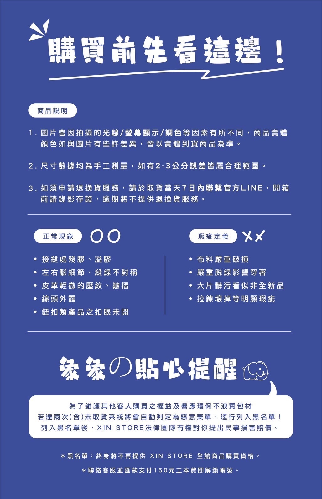重大瑕疵和贗品之外,都不能退貨退款,以上均屬法律有效條例,麻煩買家購買前確認自己訂購商品尺寸/款式/顏色,三思後再行下單。